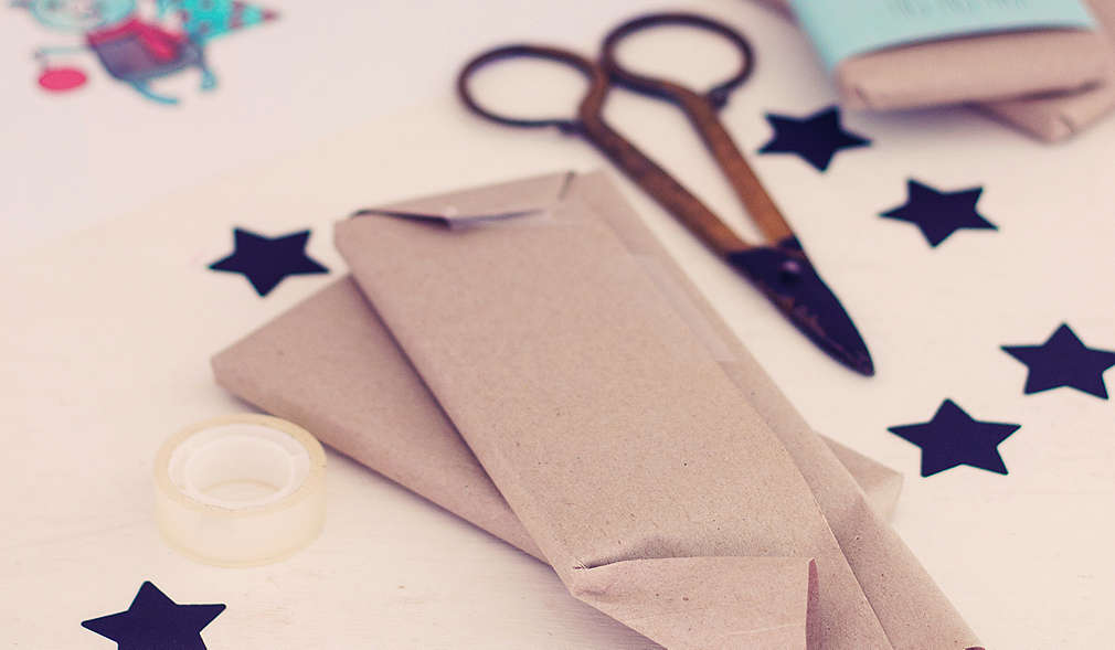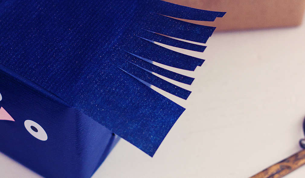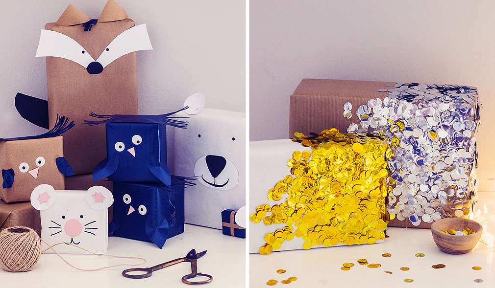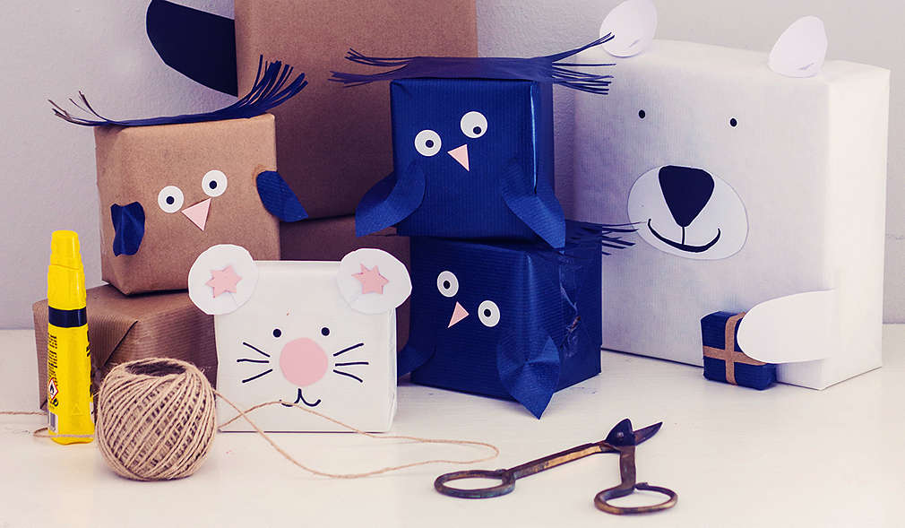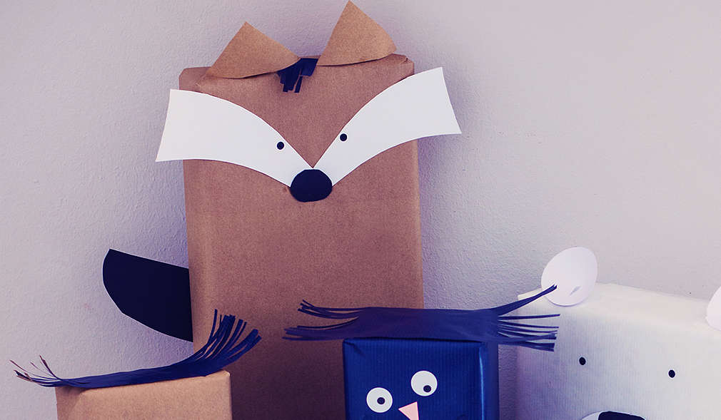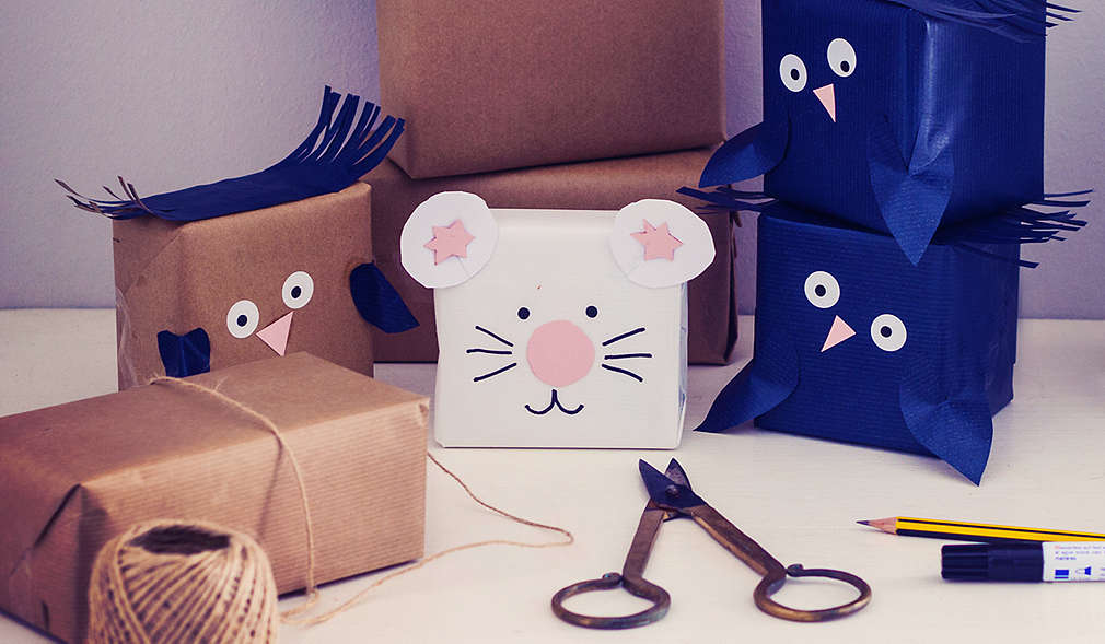 Balíčky zabalíme do hnedého baliaceho papiera. Oči vystrihneme z bieleho farebného papiera a čiernou fixkou nakreslíme zreničky alebo oči vystrihneme z predlohy. Z čierneho farebného papiera vystrihneme chvost. Z hnedého baliaceho papiera vystrihneme trojuholníky na uši a upevníme lepidlom na hornej strane balíka. Z modrého farebného papiera vystrihneme niekoľko prúžkov a nalepíme hore medzi ušami do tvaru vlasov.