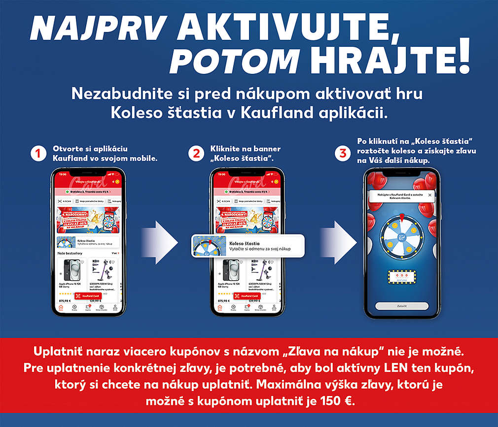 - Aktivujte si hru v Kaufland aplikácii (kliknite na banner "Koleso šťastia" a odsúhlaste Podmienky účasti v hre).