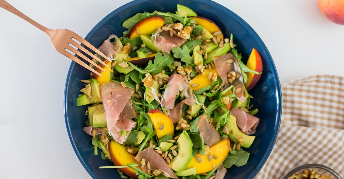 Rukolu dáme na taniera a jemne osolíme. Avokádo, broskyňu a prosciutto nakrájame na plátky a pridáme k rukole. Š