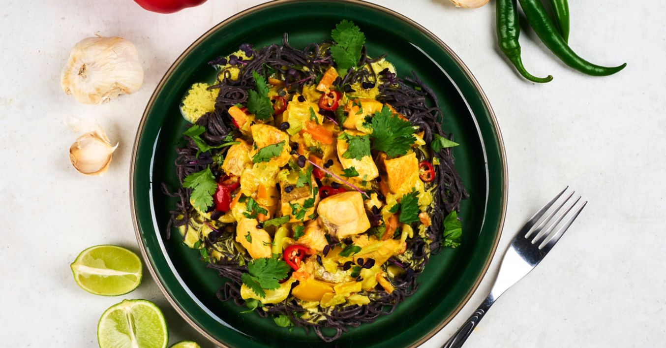 Nakoniec primiešame cestoviny a podľa chuti pridáme pár kvapiek limetkovej šťavy. Podávame posypané čerstvým nasekaným koriandrom.