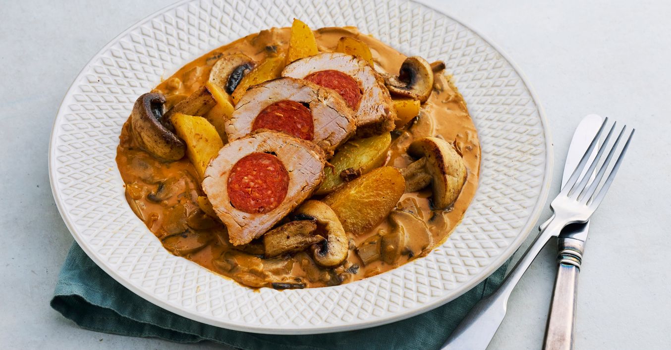 Do menšej nádoby dáme 2 PL oleja, pridáme soľ, rascu, posekaný cesnak, mletú papriku, čierne korenie a tymian. Všetko spolu premiešame a vytvoríme koreninovú zmes, ktorou potrieme panenku. Mäso tenkým nožom narežeme stredom a vložíme doň klobásu. Panenku opäť potrieme koreninovou zmesou.