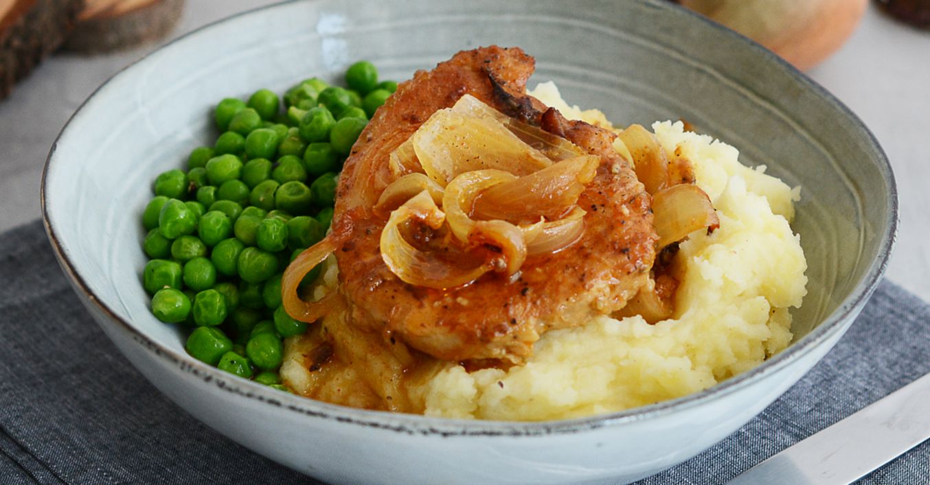 Bravčové s cibuľkou, zemiakovou kašou a hráškom na masle