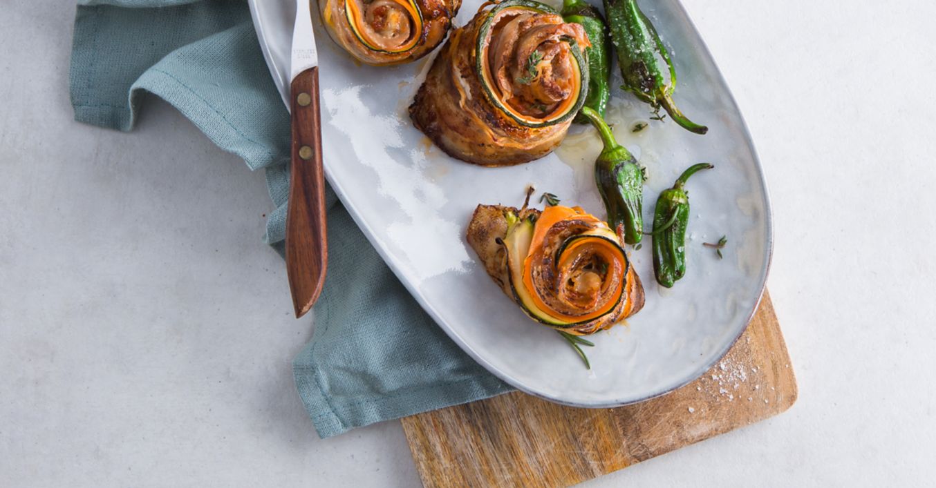 Mrkvu a cuketu umyjeme a ošúpeme, nakrájame na tenké plátky. Bravčové plátky z jednej strany natrieme pestom rosso. Ako ďalšiu vrstvu položíme na mäso plátky cukety a mrkvy.