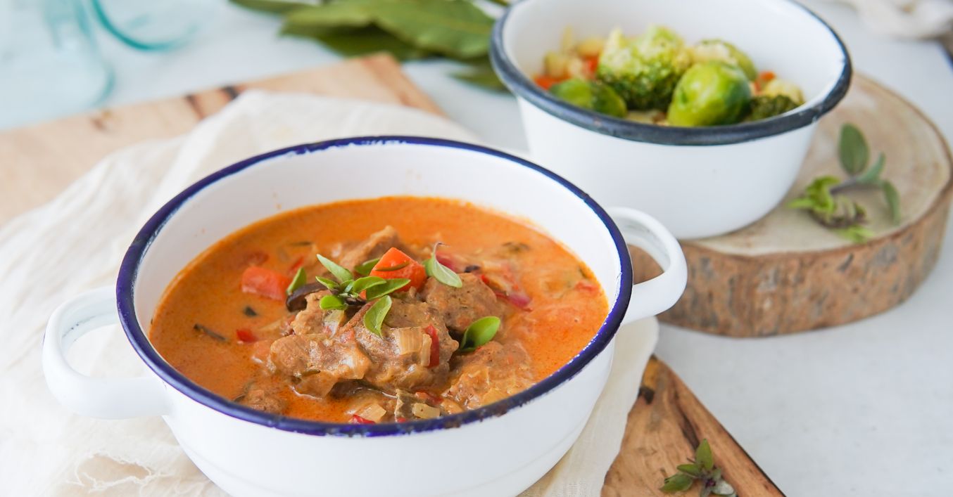 Mrkvu očistíme a nakrájame na hrubšie krúžky. Vo väčšom hrnci roztopíme lyžicu masla (prípadne olej alebo masť). Bravčové kocky orestujeme zo všetkých strán dohneda. Potom pridáme mrkvu, pretlačený cesnak, bobkový list, paradajkovú pastu a najemno nakrájanú šalotku. Všetko premiešame a restujeme niekoľko minút.
