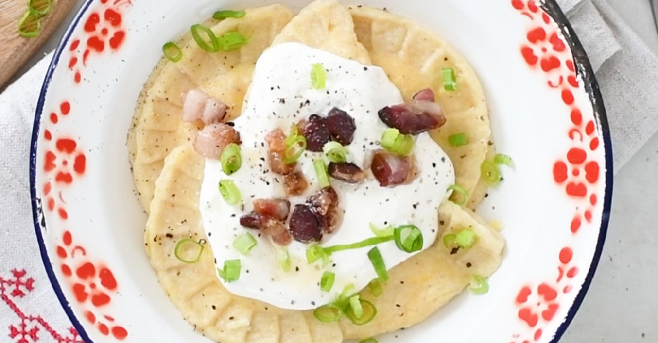 Pirohy podávame s kyslou smotanou, slaninku a so zelenou časťou jarnej cibuľky.