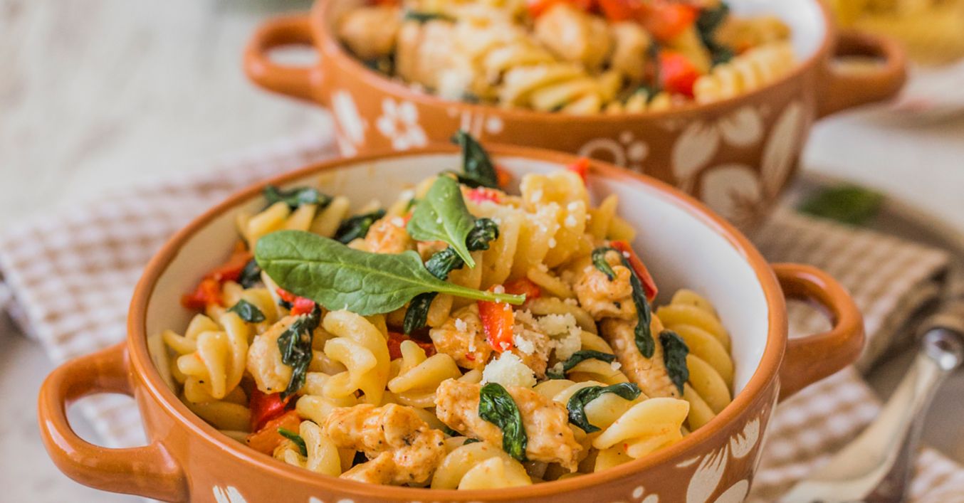 Cestoviny uvaríme podľa návodu na obale. Kuracie prsia nakrájame na kocky. Cesnak ošúpeme a nakrájame nadrobno. Papriku umyjeme, osušíme a nakrájame na menšie kocky a zo špenátových lístkov odrežeme stonky.
