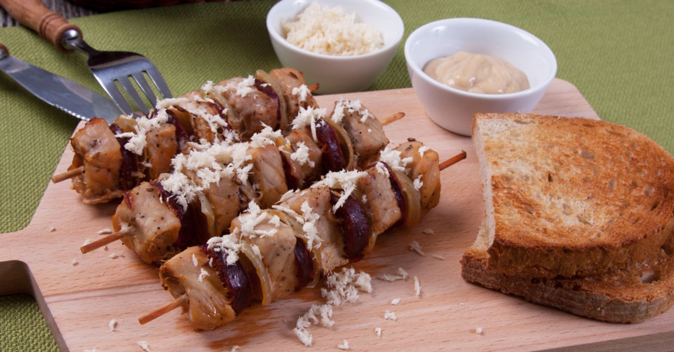 Mäso napichujeme striedavo s kolieskami klobásy a cibule na menšie ražne. Zabalíme do alobalu, vložíme na plech a pečieme hodinu v rúre vyhriatej na 200 ̊C. Podávame posypané strúhaným chrenom s opekanými hriankami a horčicou.