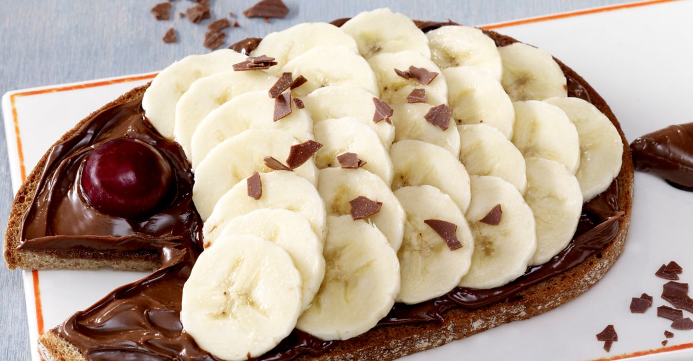 Krajce chleba natrieme nugátovým krémom. Banány ošúpeme, nakrájame na kolieska, pokvapkáme citrónovou šťavou a naukladáme na chlebíky do tvaru rybích šupín.