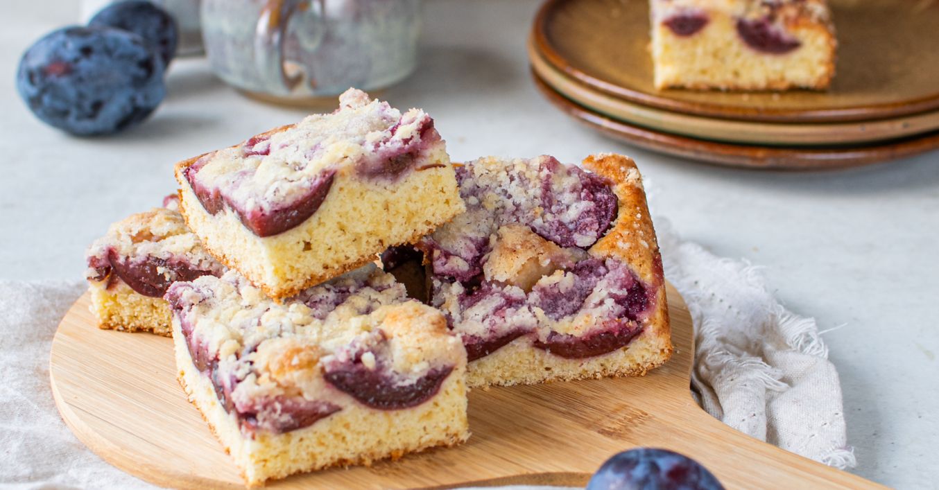 Preosiatu hrubú múku a práškový cukor zmiešame, pridáme nakrájaný rastlinný tuk, rukou rozmrvíme, premiešame a dáme na približne 1 hodinu stuhnúť do chladničky. Takto pripravenú posýpku posypeme na slivky.