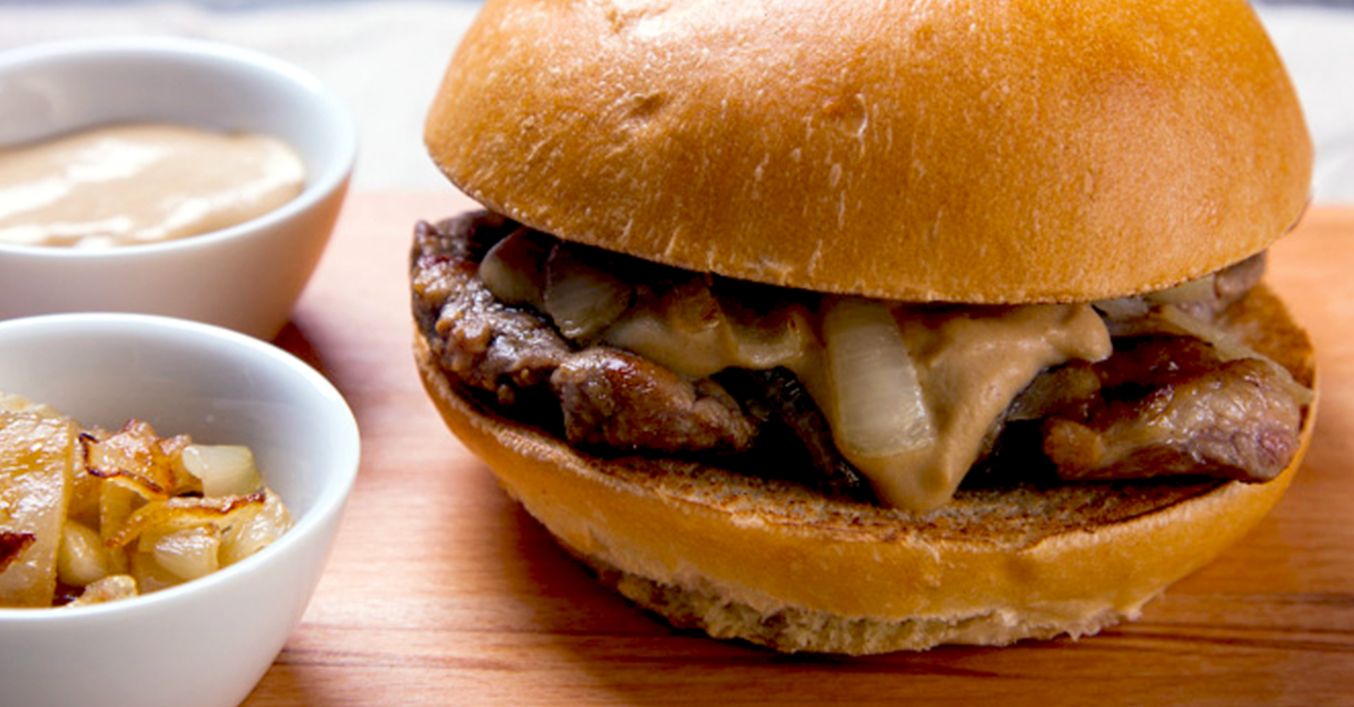 Cibuľu ošúpeme, nakrájame na tenké kolieska a na oleji opražíme. Žemľu rozkrojíme, môžeme opiecť na troche oleja, vložíme plátok mäsa, opraženú cibuľu a ochutíme horčicou.