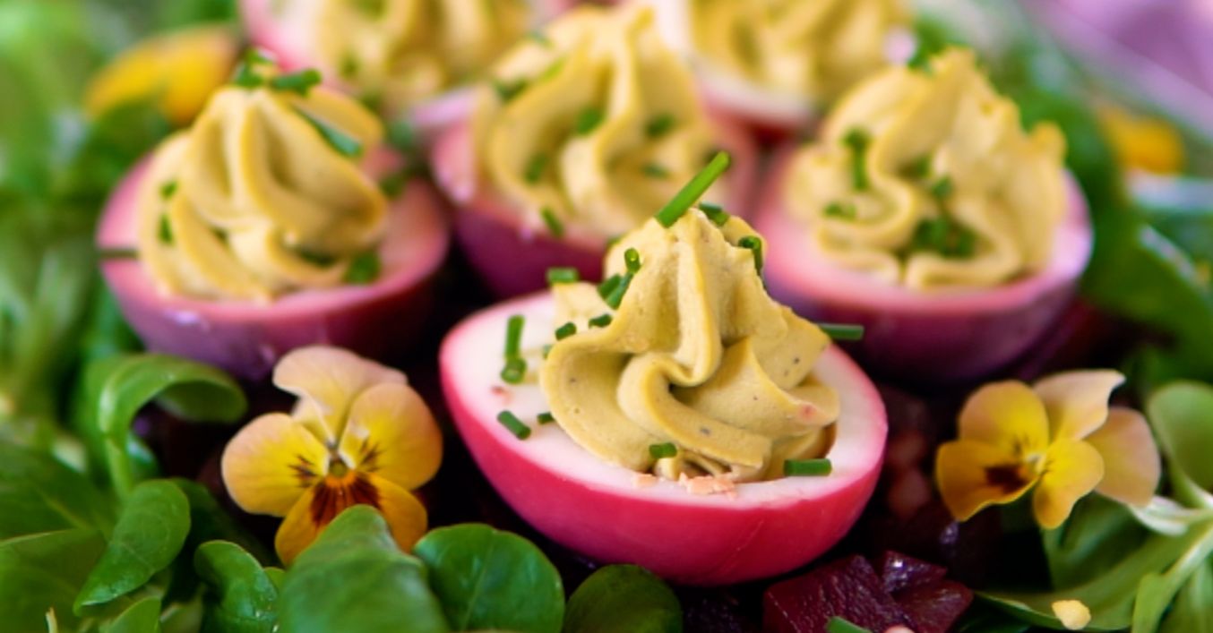 Uvarenú cviklu zmiešame s olivovým olejom, najemno nasekanou šalotkou, soľou, čiernym korením a troškou bazalky. Podávame na poľníčku spolu s ružovými vajíčkami.