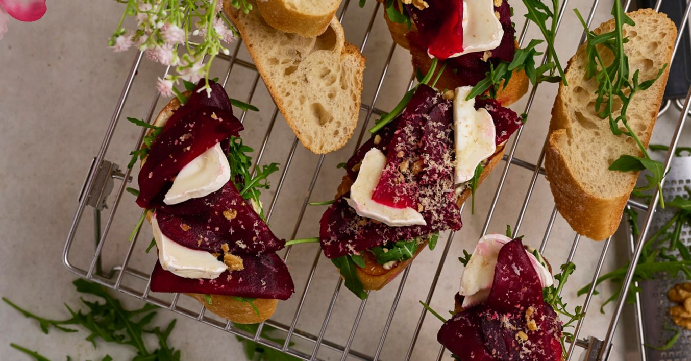 Cviklu uvaríme v šupke alebo upečieme v alobale pri teplote 200 °C, potom ošúpeme a nakrájame. Orechy nasucho opražíme. Zmiešame olej, ocot, med, soľ a korenie. Na rukolu pridáme cviklu, kozí syr, orechy a pokvapkáme zálievkou. (Autorky receptu: Baby na mizine)
