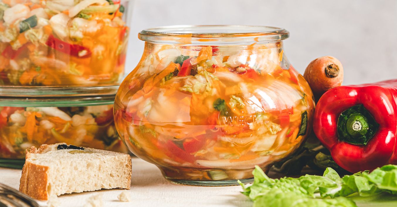 Listy čínskej kapusty opláchneme, necháme odkvapkať a nakrájame na menšie pásiky. Mrkvu aj hrušky očistíme a nahrubo nastrúhame. Očistenú cibuľu a umytú papriku nakrájame na tenšie pásiky, jarnú cibuľku na kolieska. Všetku zeleninu dáme do hrnca a pripravíme si nálev.