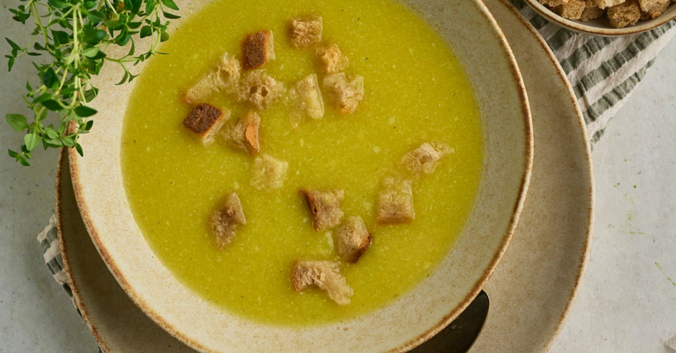 Chlieb nakrájame na kocky, polejeme olivovým olejom a premiešame s prelisovaným cesnakom. Pečieme pri 180 °C 10 minút. V hrnci rozpustíme maslo s olejom, opražíme nasekaný cesnak a pridáme nakrájané zemiaky, rascu, soľ, korenie a vývar. Varíme 15 minút. Odstavíme, pridáme majoránku a rozmixujeme, ak chceme krémovejšiu polievku. Nalejeme do misiek, posypeme syrom a pridáme krutóny. (Autorky receptu: Baby na mizine)