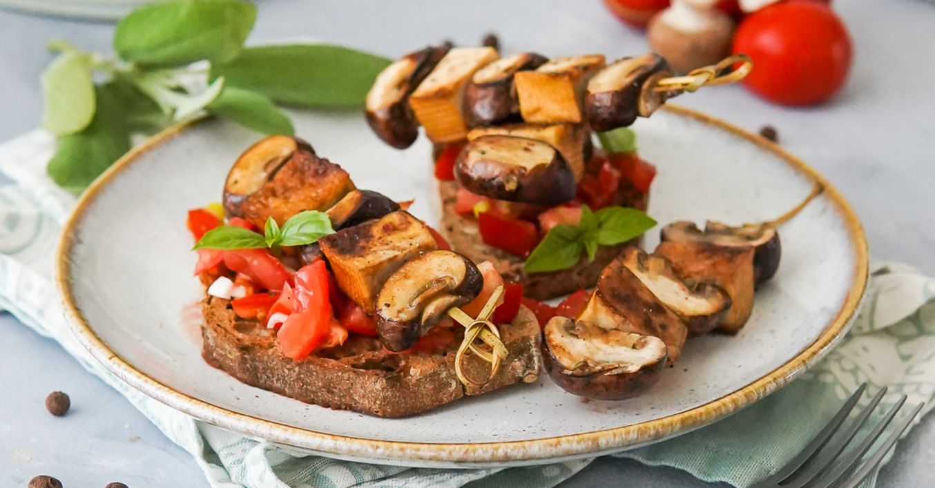 Pripravené šampiňóny a tofu na striedačku ponapichujeme na grilovacie ihlice. Opečieme na grile z oboch strán dohneda. Za ten čas si nakrájame chlebík a tiež ho opečieme z oboch strán.