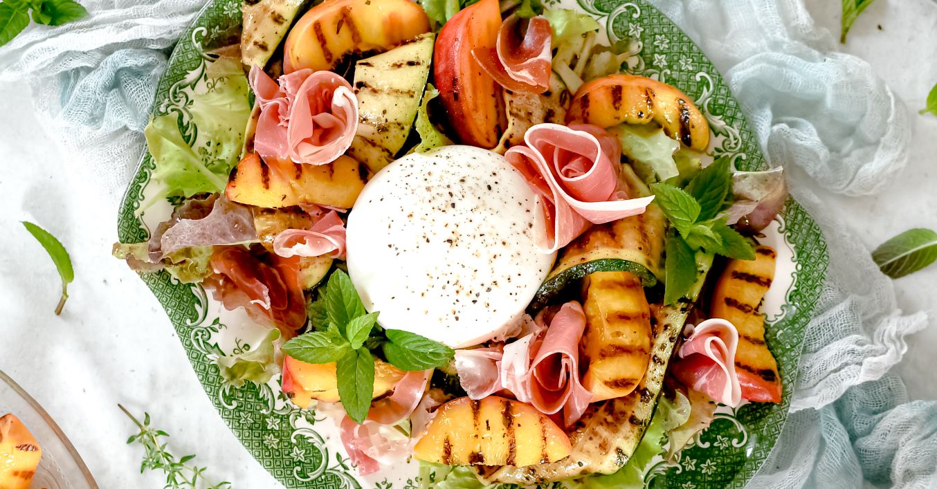 V miske zmiešame olivový olej, vínny ocot, horčicu a javorový sirup. Na tanier dáme lístky hlávkového šalátu, polejeme marinádou, pridáme cuketu a poriadne osolíme a okoreníme. Potom pridáme grilované broskyne a do stredu taniera burratu. Na záver pridáme plátky prosciutta a okoreníme.