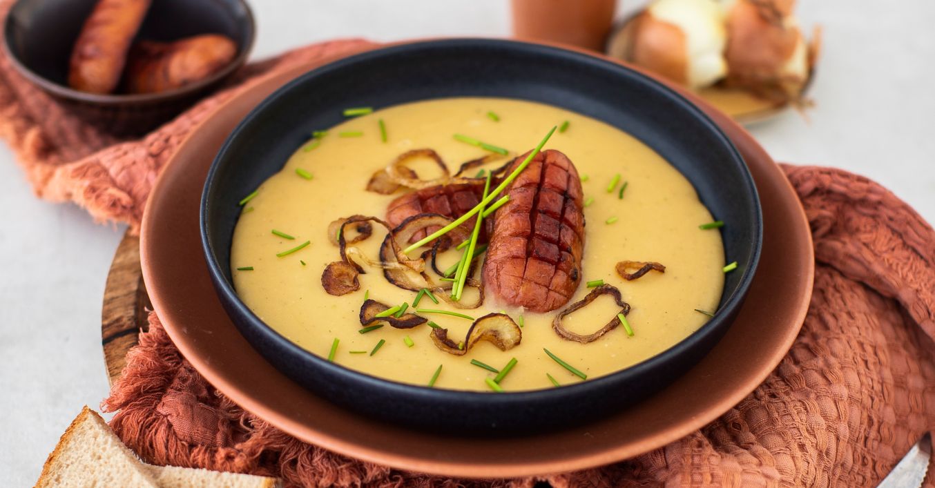 Na tanier naložíme hrachovú kašu, pridáme špekáčik a opečenú cibuľku.