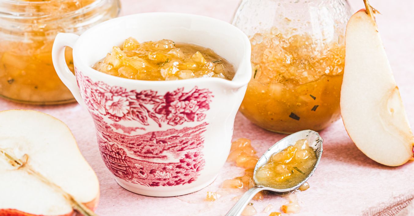 Ak je to potrebné, džem dosladíme. Rozmarín odstopkujeme a listy nakrájame nadrobno. Drobné kúsky rozmarínu pridáme do džemu, premiešame a varíme ďalších 15 až 30 minút. Či je džem hotový, overíme tak, že kúsok odoberieme na tanierik, necháme trochu vychladnúť a prejdeme prstom cez stred. Keď zostane cestička, je hotový. Na dosiahnutie jemnej konzistencie môžeme džem rozmixovať, prípadne rozmixovať len časť, aby v džeme zostali drobné kúsky hrušiek.