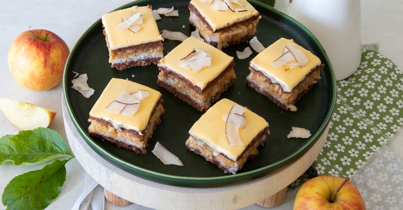 Stuhnuté cesto rozdeľte na polovicu. Plech potrite maslom a vysypte múkou. Prvú časť cesta rozvaľkajte na veľkosť plechu, utlačte ho doň a potrite džemom. Naneste kokosovú plnku, na ňu rovnomerne rozprestrite strúhané jablká (ak pustili veľa šťavy, vyžmýkajte ich) a posypte vanilkovým cukrom. Vyvaľkajte aj druhú časť cesta a prikryte ním jablká. Dobre utlačte, popichajte vidličkou a dajte piecť do rúry vyhriatej na 180 °C.