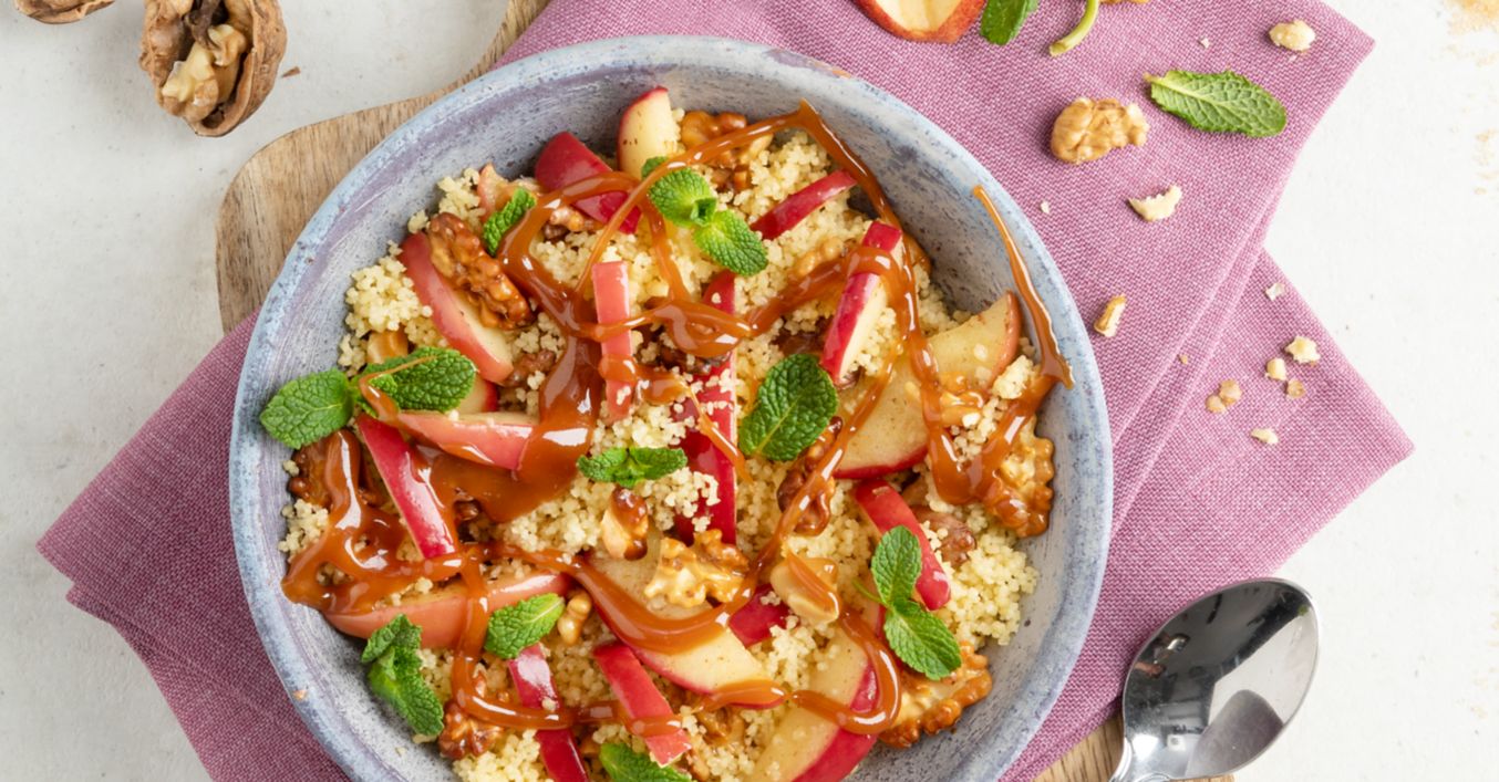 Kuskus s mesiačikmi jabĺk pripravíme do misiek, pokvapkáme omáčkou, ozdobíme orechmi a servírujeme.