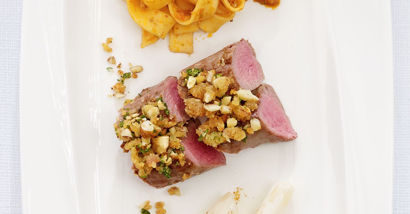 Rozmrazené mäso posypeme soľou, korením, krátko opečieme v panvici na rozpálenom olivovom oleji a preložíme do zapekacej formy. V nádobe zmiešame bylinky, oriešky, múku, vajce a jemné maslo s morskou soľou. Hotovou zmesou rovnomerne potrieme povrch mäsa. Vložíme do rúry a pri teplote 200 °C (plynová: stupeň 4, teplovzdušná: 180 °C) pečieme cca 15 až 20 minút.