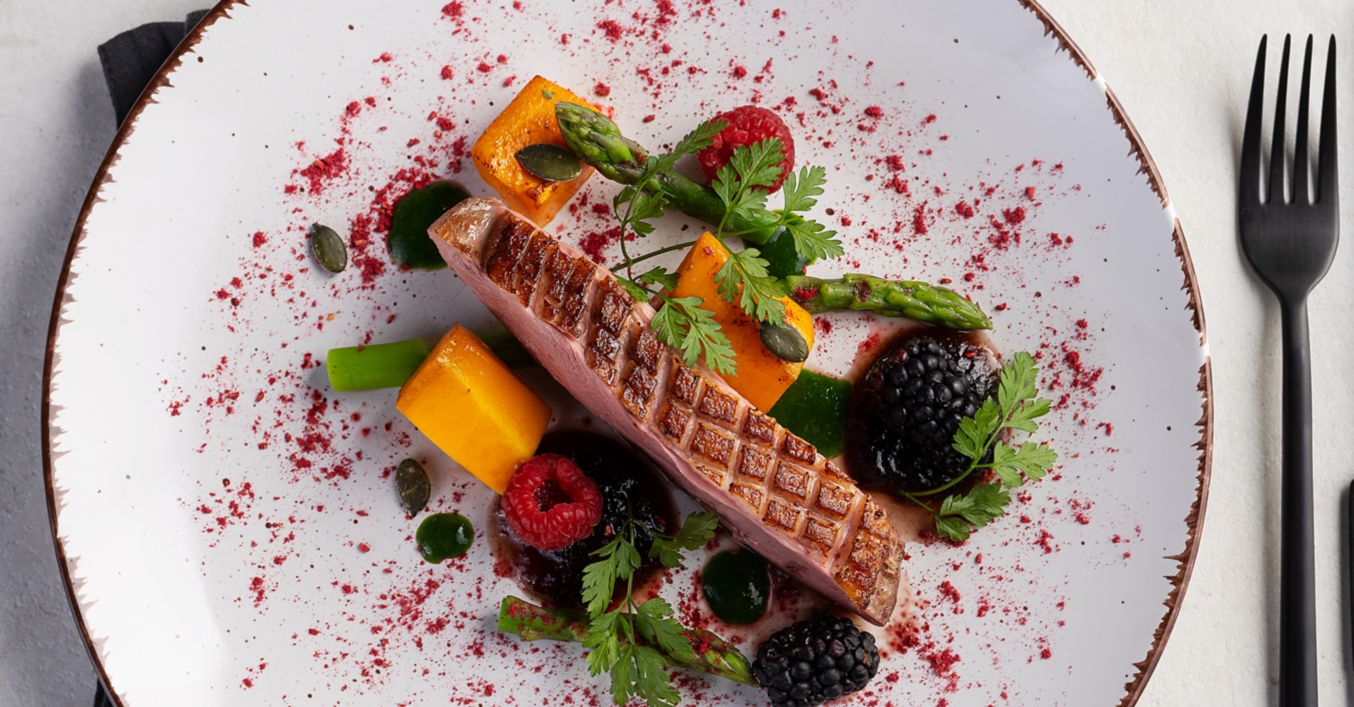 Kačacie prsia podávame s omáčkou, grilovanou tekvicou, oblanšírovanou zelenou špargľou, černicami a malinami.