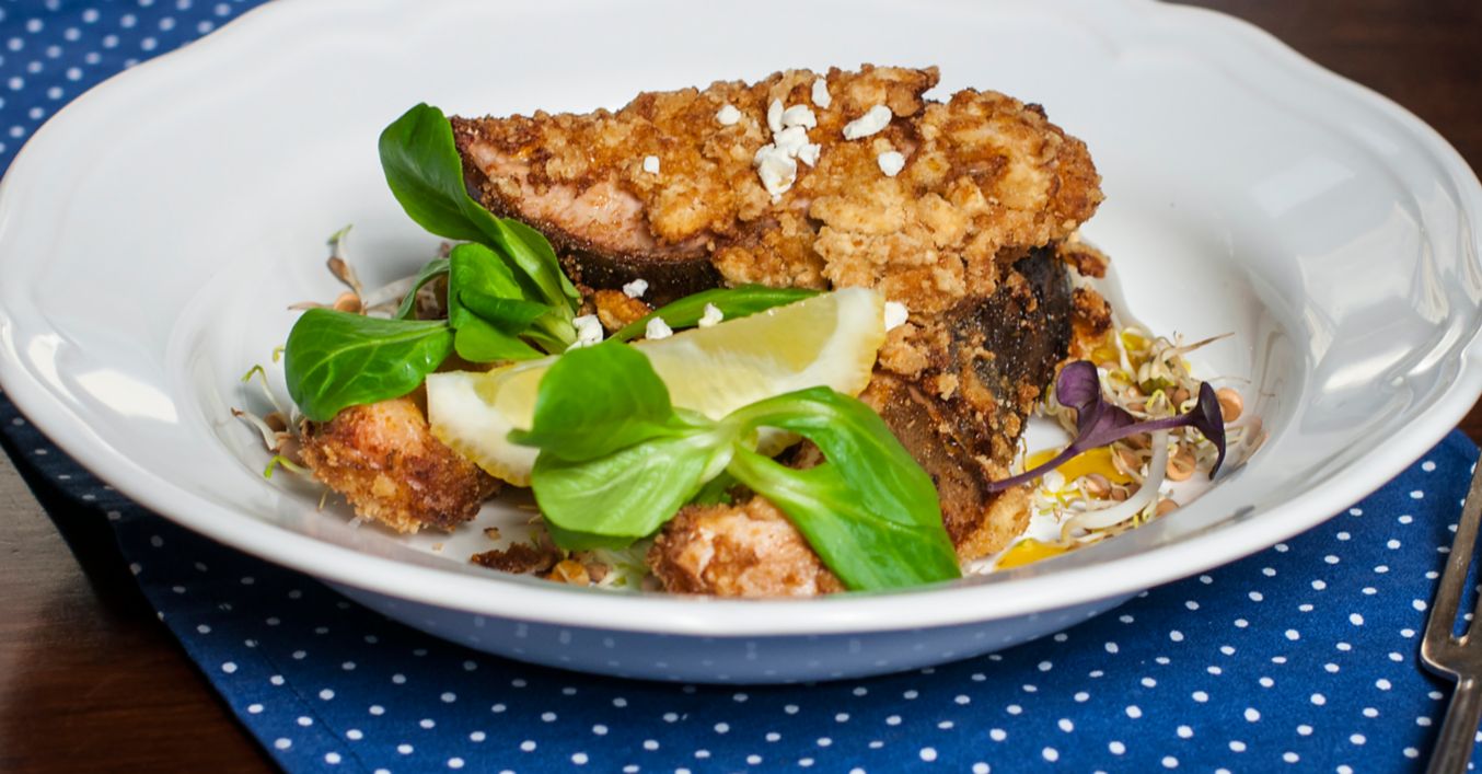 Všetky suroviny na marinádu spolu zmiešame. Porcie kapra vložíme do marinády a necháme 12 minút odpočívať v chlade. Naloženého kapra obalíme v polohrubej múke, vajci a strúhanke. Na rozpálenom oleji vypražíme do zlatista.