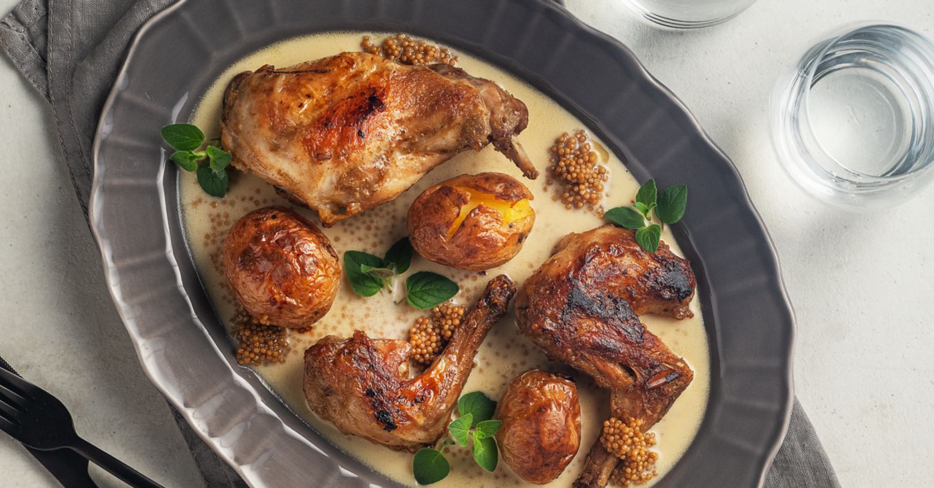 Králik na horčici s pečenými zemiakmi od Pána Tymiana