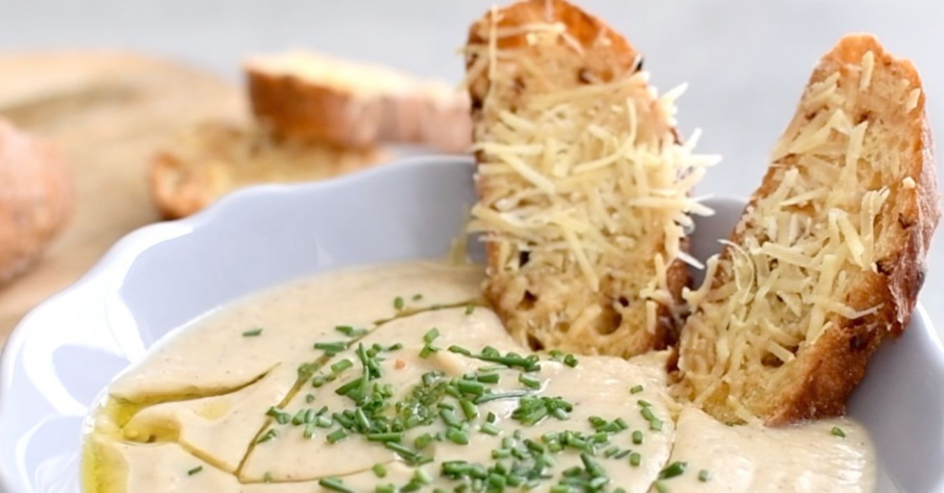 Za ten čas si na masle opečieme najemno nakrájanú cibuľu. Pridáme k nej opečený karfiol s cesnakom, zalejeme vývarom a necháme zovrieť. Rozmixujeme ponorným mixérom a dochutíme muškátovým orieškom a zjemníme trochou mlieka.
