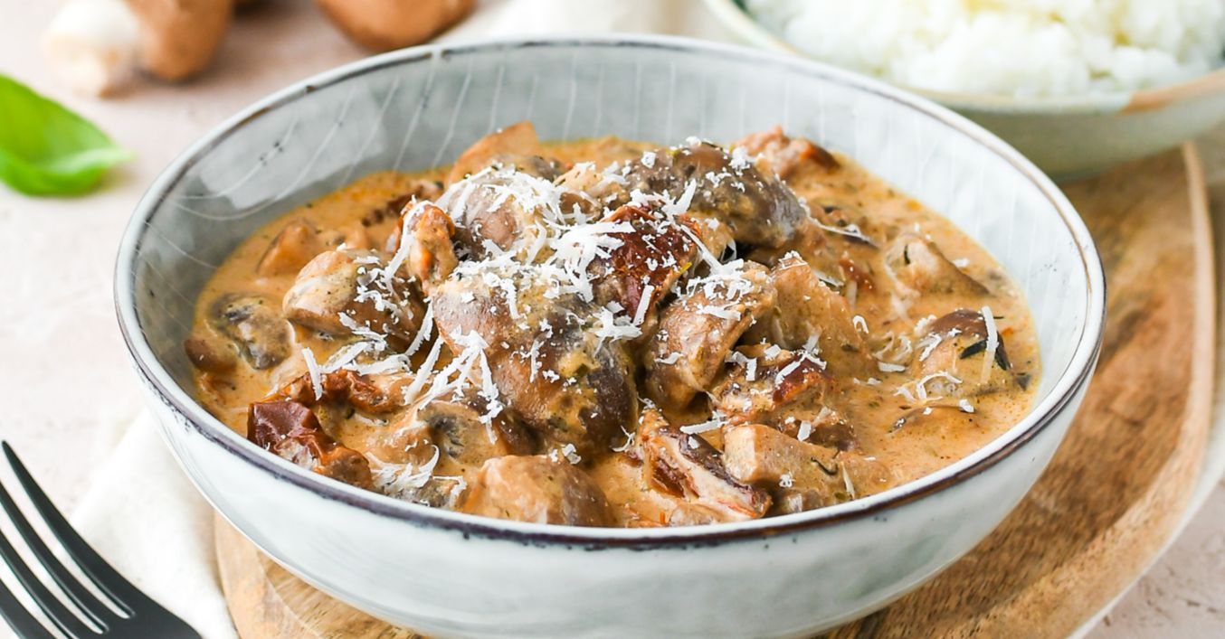 Dochutíme soľou, korením a sušenými bylinkami. Pridáme nakrájane sušené paradajky, podlejeme smotanou na varenie a na miernej teplote povaríme približne 10 až 15 minút. Pridáme lyžicu nastrúhaného parmezánu a nadrobno nakrájanú čerstvú bazalku. Podávame s varenou ryžou a posypané strúhaným parmezánom.