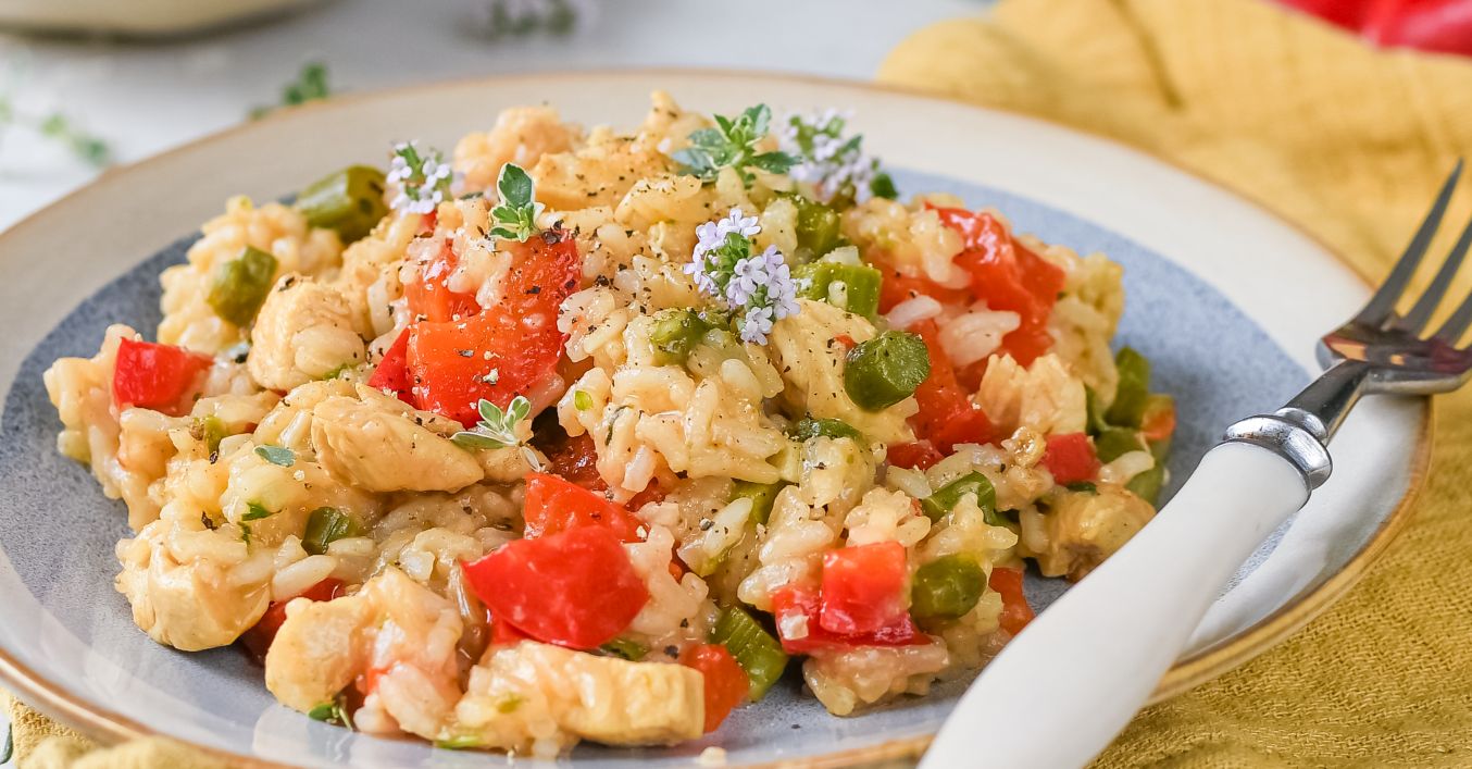 Na panvici rozpálime olej a pridáme kuracie kúsky, opečieme ich. Potom k nim pridáme nakrájanú papriku a špargľu. Všetko spolu opečieme, pridáme ryžu a premiešame. Pridáme vetvičku rozmarínu a tymianu, zalejeme vývarom (alebo vodou) a na nízkej teplote varíme, kým ryža nezmäkne.