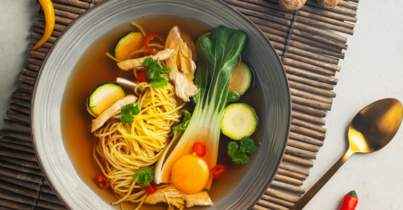 Z vývaru vyberieme kuracie mäso a pridáme doň zázvor, cesnak, čili a cuketu. Spolu varíme 5 minút. Do polievky na záver pridáme Pak Choi a varíme ešte maximálne 2 minúty.