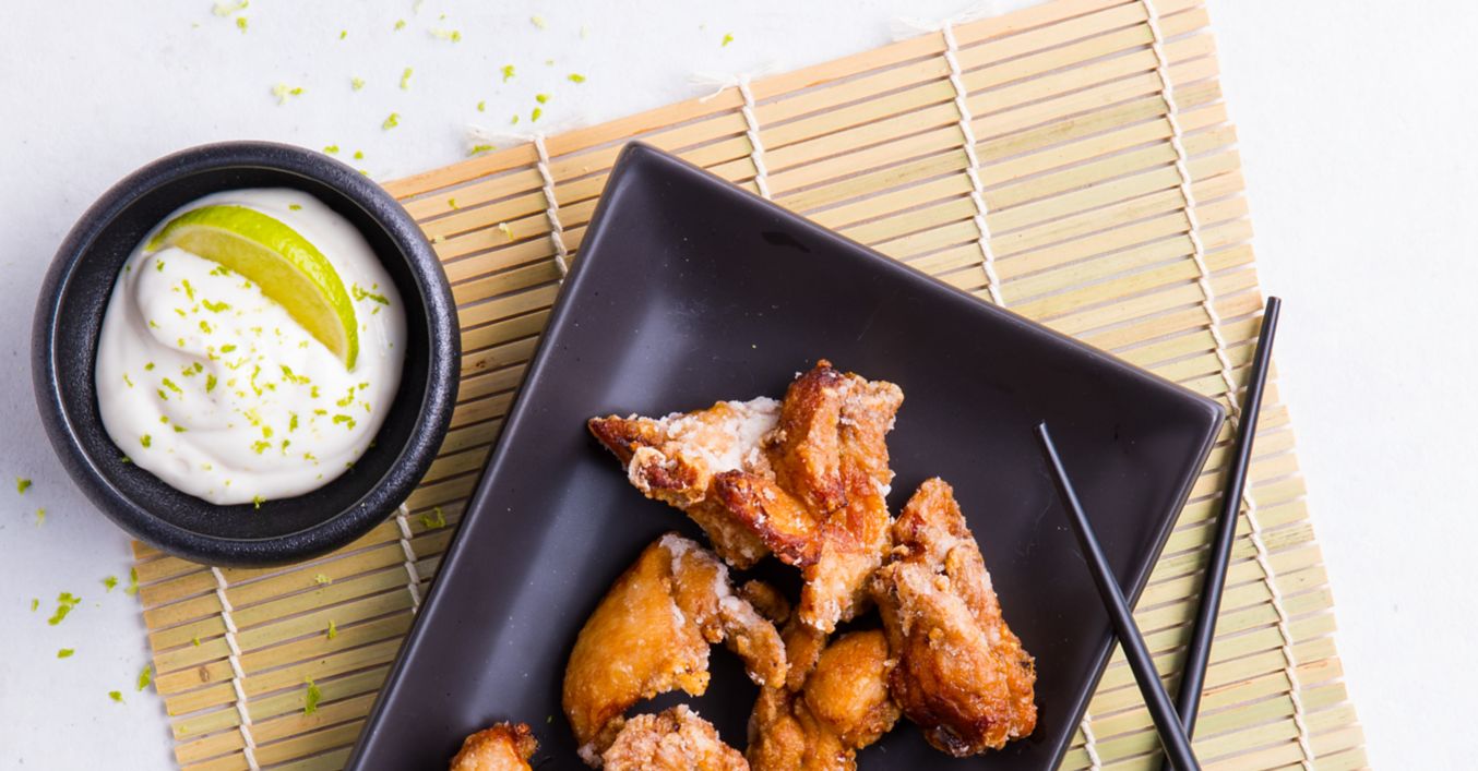 Mäso vyberieme z vrecka, obalíme v kukuričnom škrobe a opečieme na rozohriatom oleji do chrumkava. Majonézu premiešame s jogurtom, primiešame zvyšnú limetkovú šťavu a kôru, ochutíme soľou, korením a cukrom.
