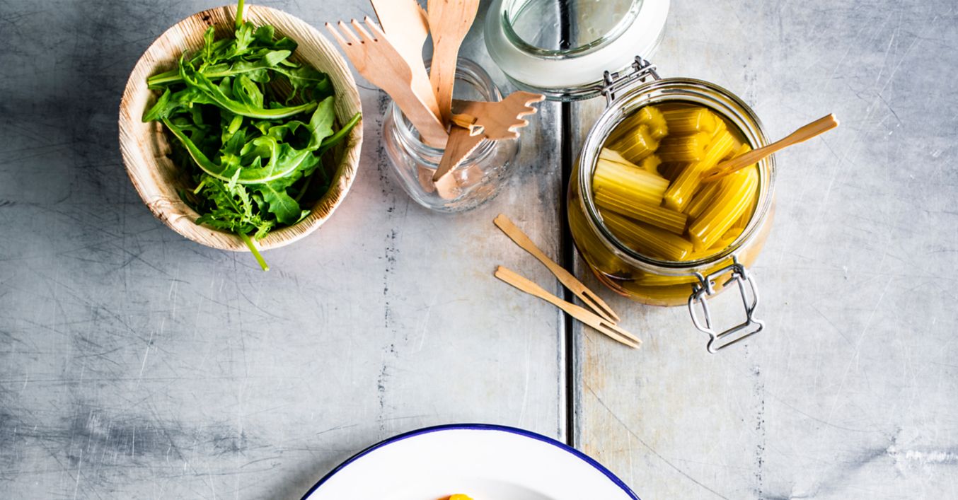 Umyjeme a osušíme rukolu. Zeler nakrájame na plátky. Rozohrejeme grilovaciu panvicu a krídelká grilujeme z každej strany asi 2 minúty. Osolíme a naservírujeme s pyré, zelerom a rukolou.