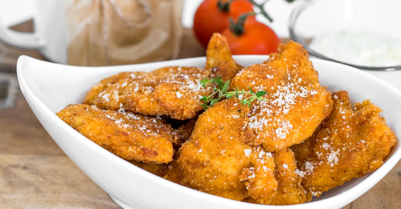 Kuracie kúsky osolíme a obalíme. Rozpálime olej a nugetky pečieme z každej strany asi 3 minúty dozlatista. Pred podávaním ich ešte posypeme parmezánom.