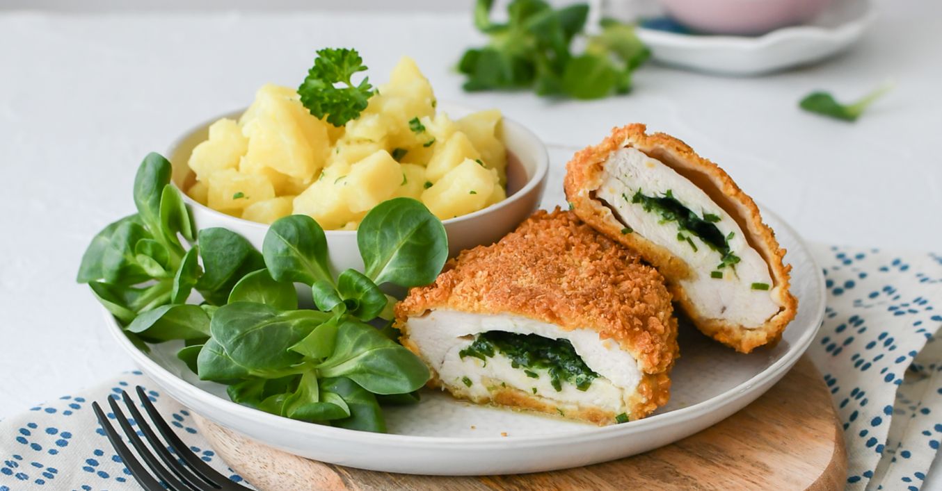 Kuracie prsia umyjeme, osušíme a jemne naklepeme dlaňou, aby sa len mierne rozprestreli. Potom každé na boku opatrne narežeme tak, aby sme urobili kapsičku. Vychladené maslo nakrájame na kolieska a vložíme do kuracích pŕs. Kuracie prsia z oboch strán osolíme a okoreníme.