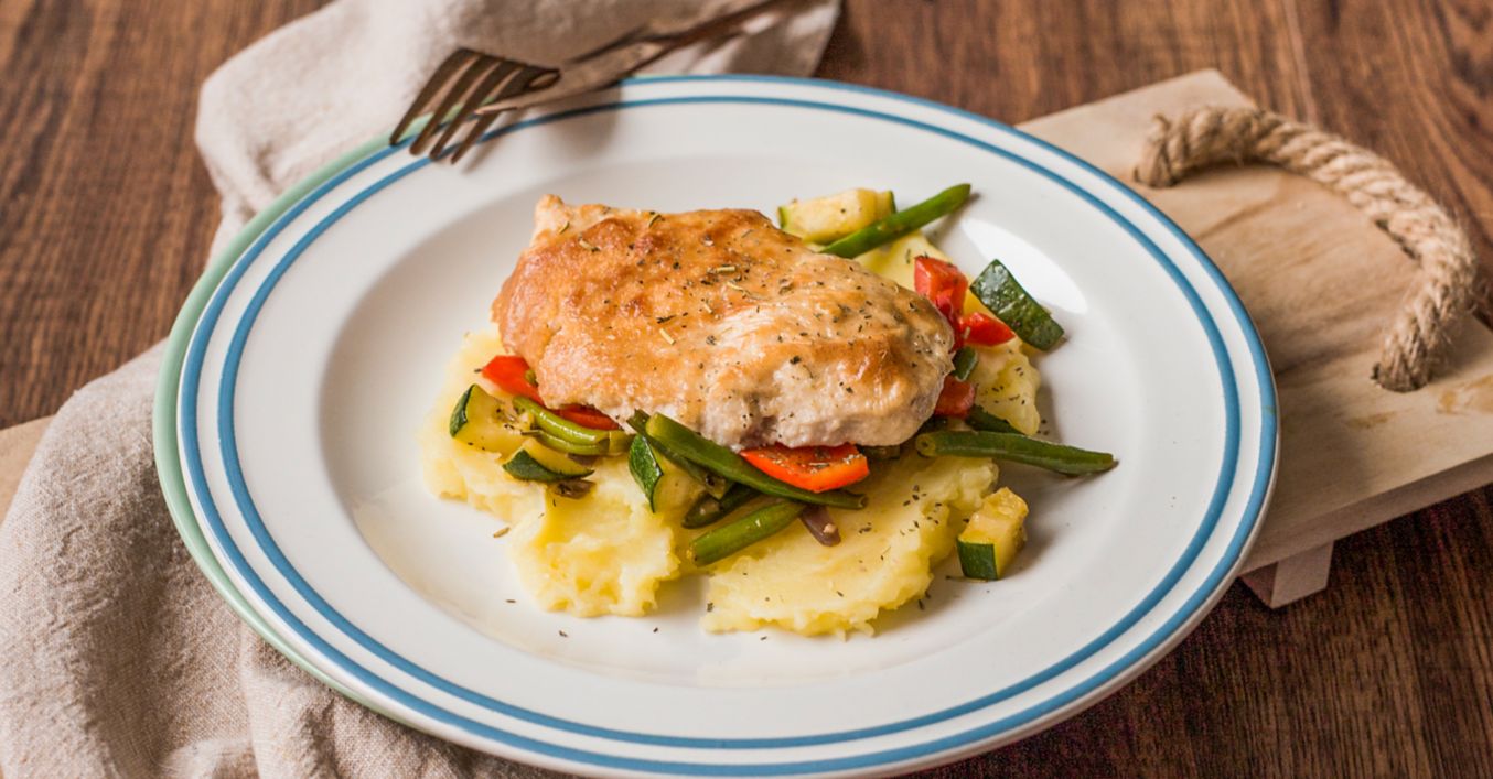 Mäso naservírujeme na tanier s ugrilovanou zeleninou a podávame so zemiakovou kašou.