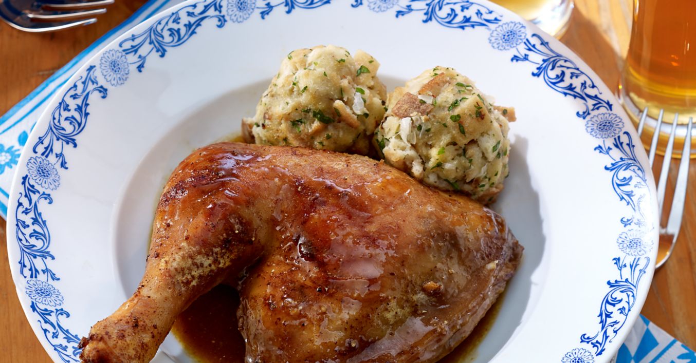 Knedľovú zmes vytvarujeme vlhkými rukami na 12 knedlí a necháme vylúhovať v dostatočne vriacej slanej vode asi 8 až 10 minút. Kurča vyberieme a postavíme do tepla, polovicu vzniknutého výpeku nalejeme do hrnca a doplníme vývarom a svetlým pivom. Omáčku zahustíme zahusťovadlom omáčok, okoreníme horčicou, rascou, soľou a čiernym korením.