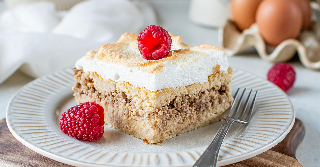 Zapekaciu misku vymastíme kokosovým olejom a vysypeme kokosom. Polovicu zmesi dáme na dno, potom pridáme vrstvu jabĺk a druhú polovicu kuskusu. Kuskus dáme piecť pri 180 °C, a keď je na povrchu zlatohnedý, vyberieme ho. Potrieme ho zvyšným snehom a vrátime na pár minút do rúry, kým nie je sneh na povrchu zlatohnedý.