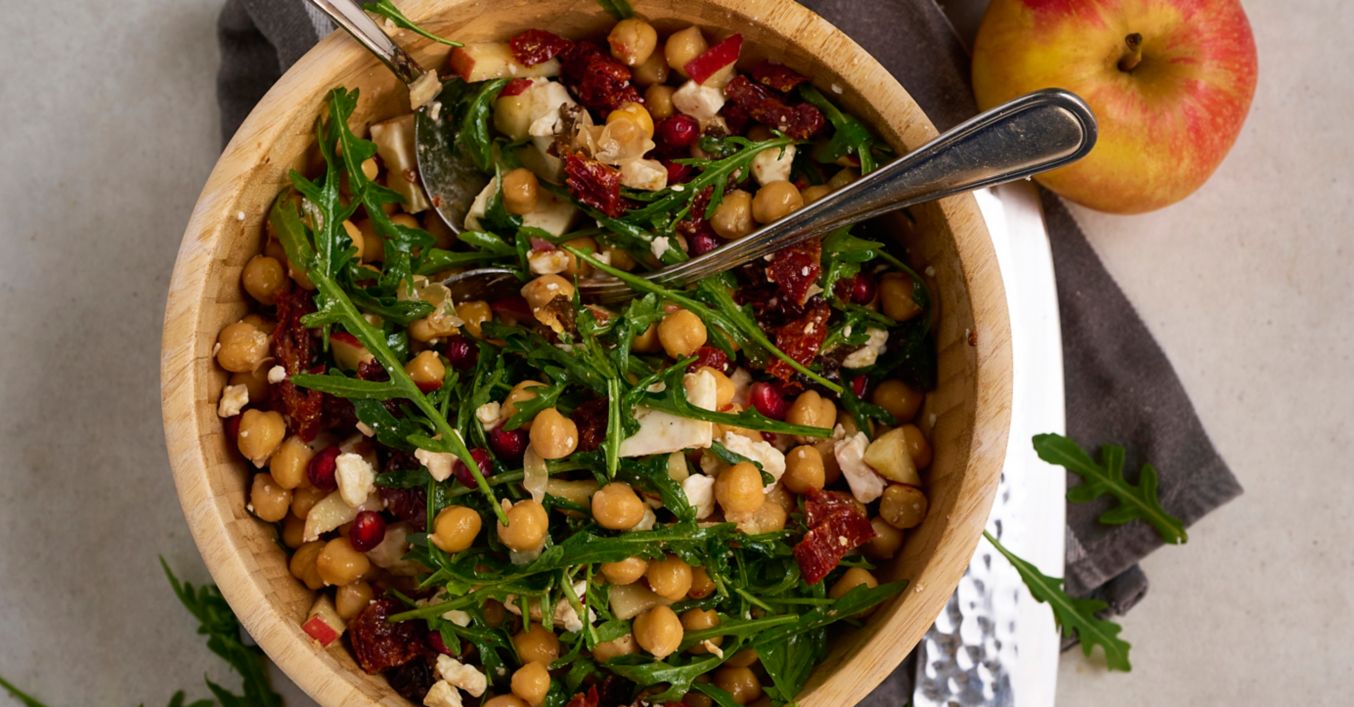 Cícer prepláchneme a zmiešame ho so sušenými paradajkami, granátovým jablkom, jablkom a slivkami. V malej miske si pripravíme dresing z citrónovej šťavy, javorového sirupu, olivového oleja, soli a korenia a nalejeme ho na šalát. Na záver posypeme feta syrom. (Autorky receptu: Baby na mizine)
