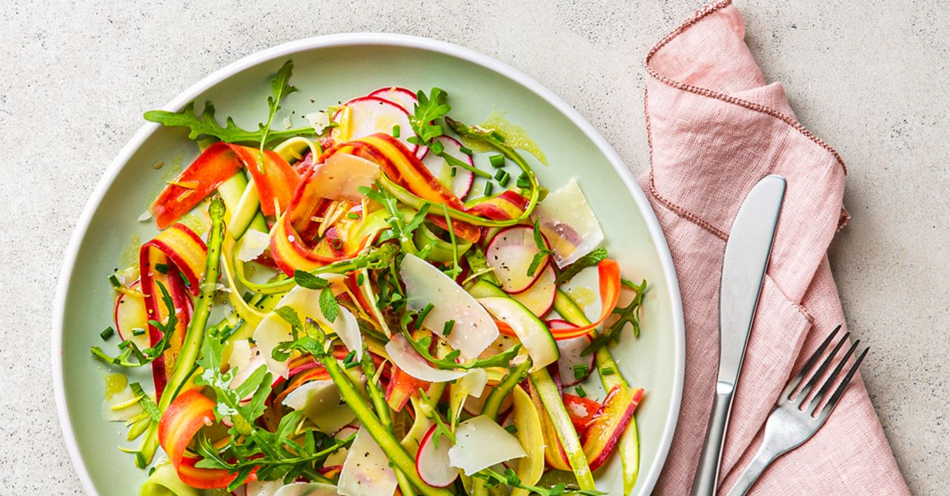 Zeleninové pásiky, rukolu, bylinky a dresing zmiešame, posypeme hoblinkami Parmigiano Reggiano a podľa chuti podávame s bagetou.