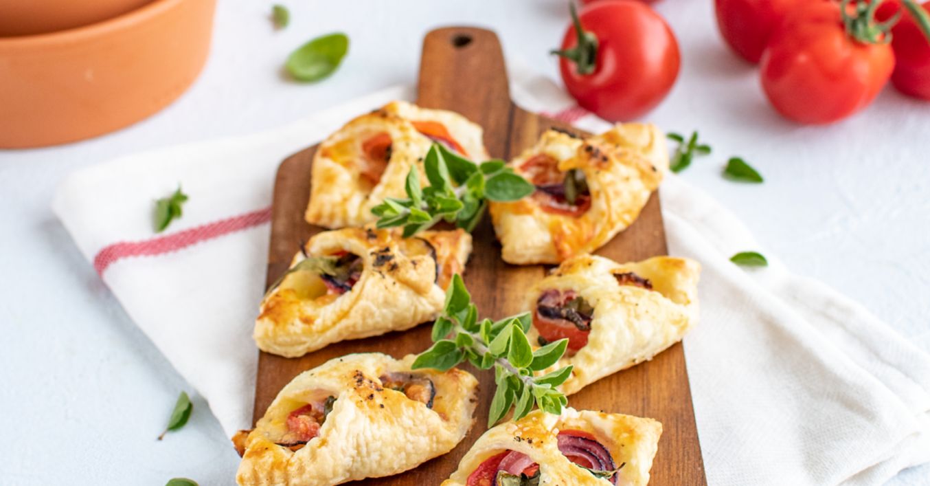 Lístkové cesto nakrájame na štvorce také veľké, aby sa do stredu zmestil plátok paradajky. Paradajky, mozzarellu a cibuľu nakrájame na plátky. Do stredu každého lístkového cesta dáme plátok paradajky, cibuľky, mozzarelly a kúsok prosciutta. Dochutíme soľou, korením a čerstvou bazalkou. Dva oproti sebe ležiace okraje spojíme, taštičky potrieme vajíčkom a pečieme pri 180 °C do zlatista.
