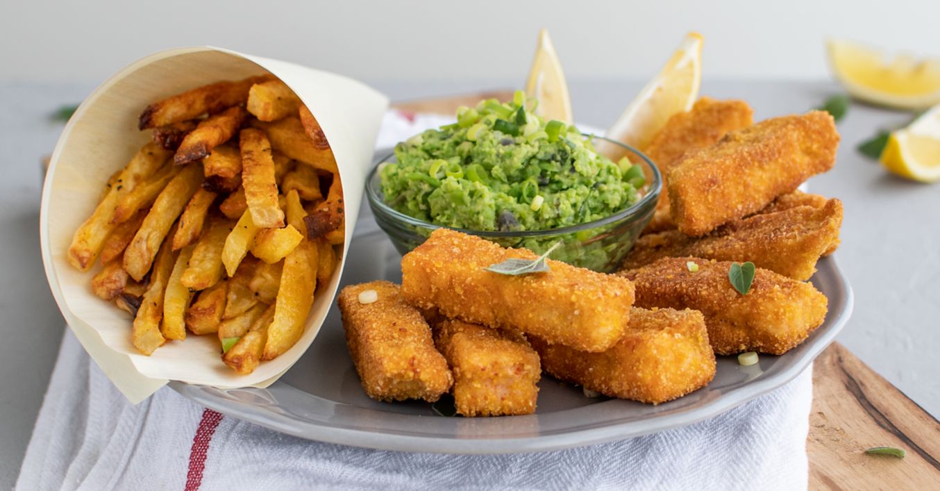 Lososové rybie prsty s domácimi hranolčekmi a hráškovým pyré