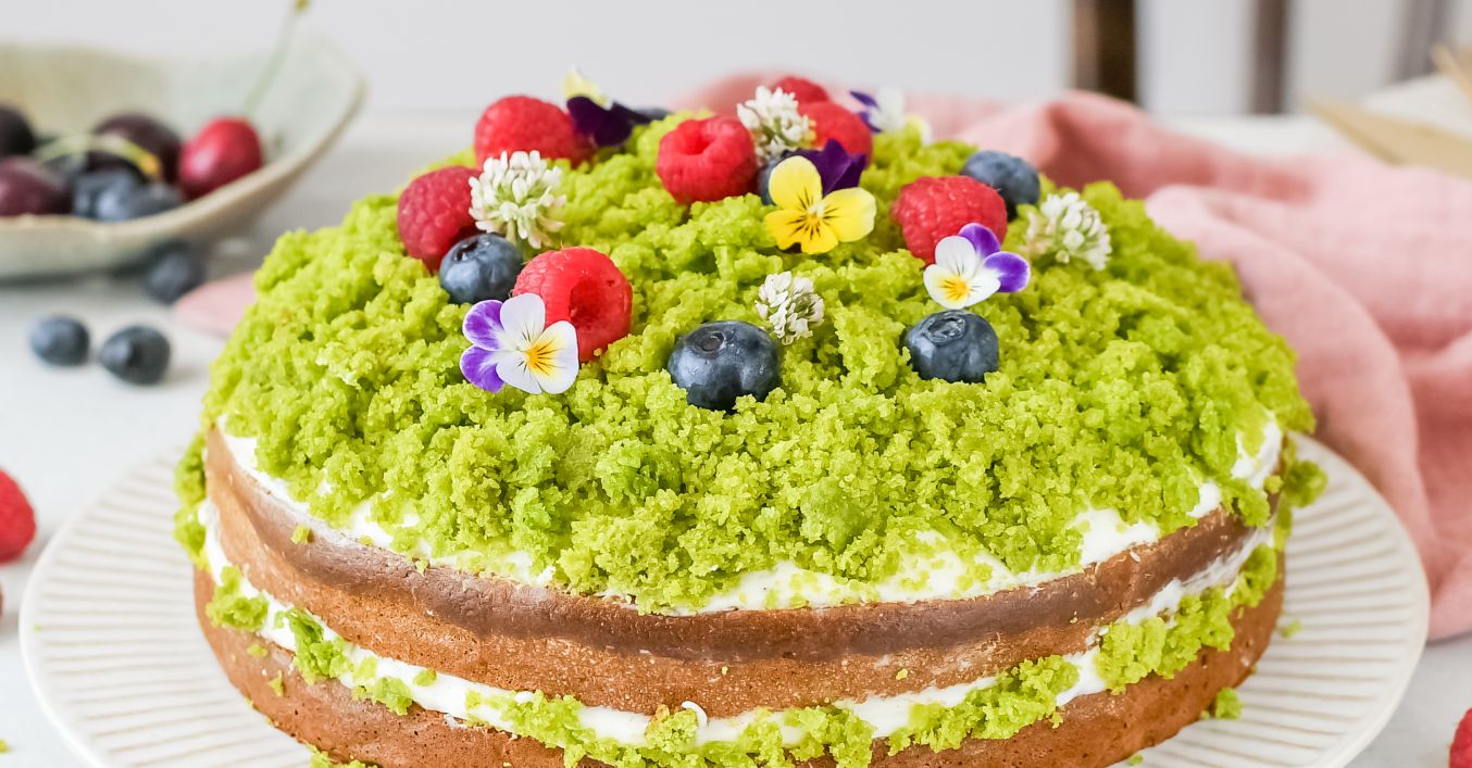 V miske vyšľaháme smotanovú nátierku, šľahačku, cukor a vanilku. Spodný korpus potrieme ovocným džemom a tretinou krému. Prikryjeme druhým korpusom, ktorý tiež potrieme džemom a zvyšným krémom. Krém vytvarujeme do kopčeka, ktorý posypeme rozmrveným korpusom. Dozdobíme ovocím a jedlými kvetmi.
