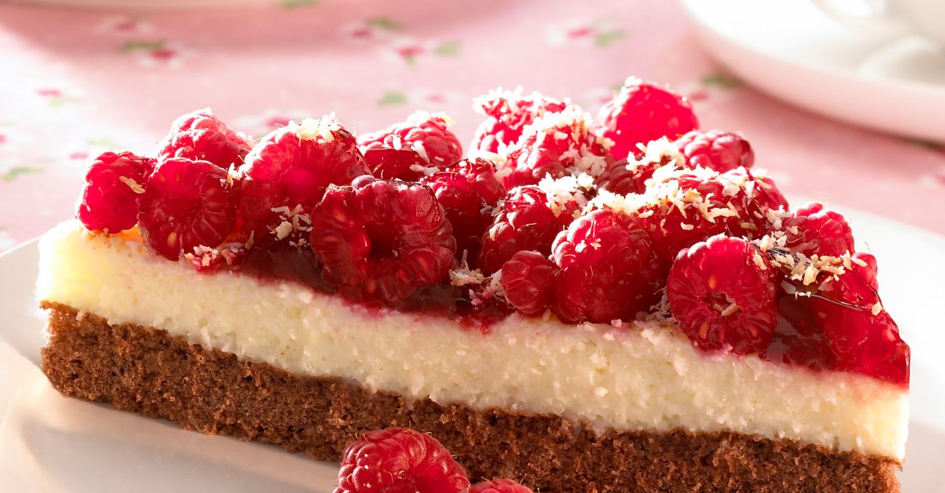 Mlieko uvaríme s maslom a cukrom. Primiešame krupicu, kokos a na 20 minút odstavíme. Pripravíme želatínu, primiešame ju ku krému a necháme vychladnúť.Šľahačku so stužovačom vyšľaháme a primiešame ku krému. Koláč potriemekrémom a ozdobíme malinami.