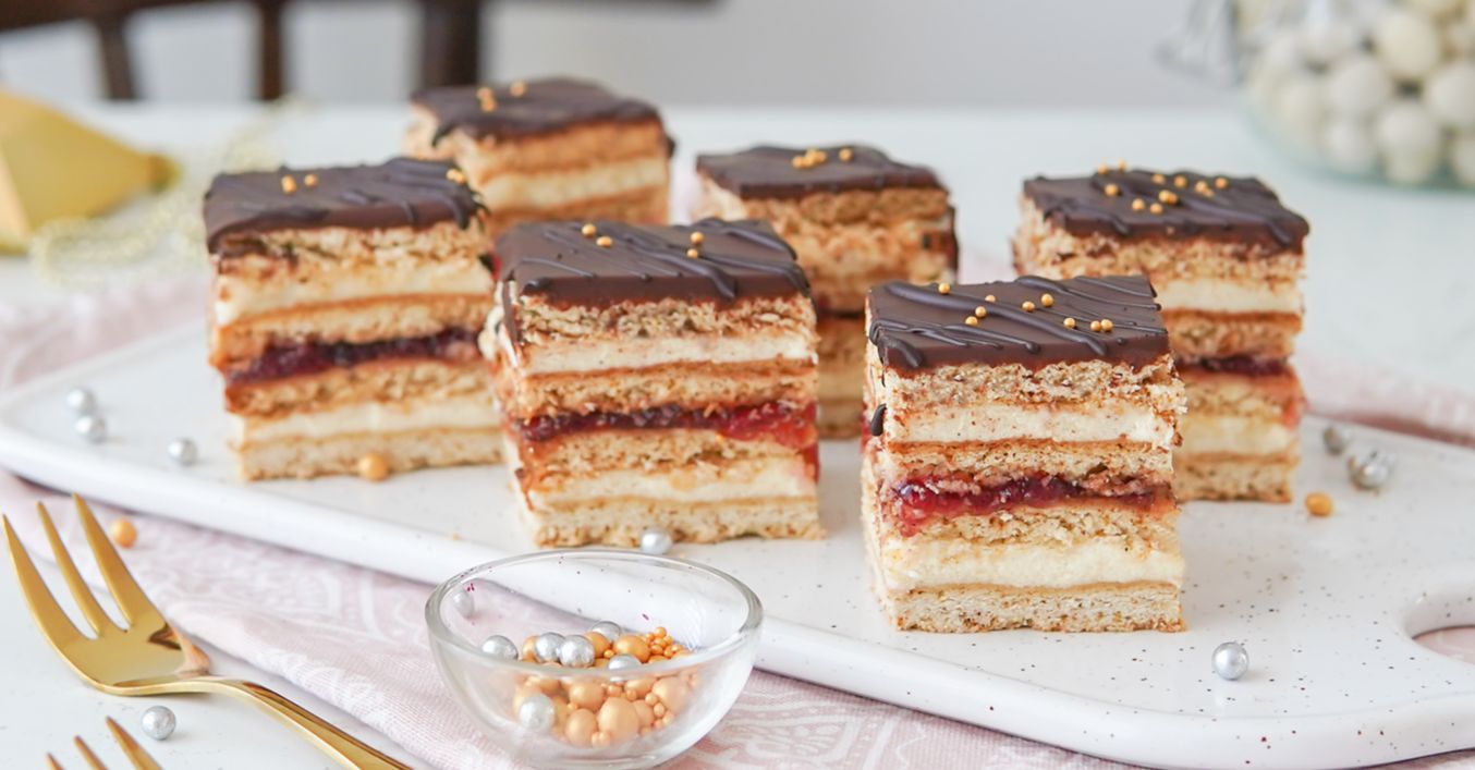 Cesto rozdelíme na polovicu a obe časti vyvaľkáme na obdĺžnik. Dáme na plech vystlaný papierom na pečenie, popicháme vidličkou a pečieme pri 170 °C 9 až 10 minút. Po upečení vyberieme a ešte teplé pláty prekrojíme na polovicu. Získame tak 4 rovnaké pláty.