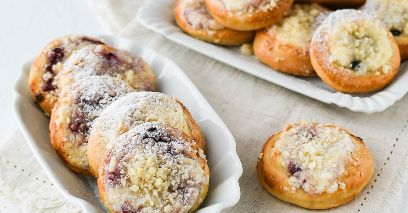Nakysnuté cesto premiesime a rozdelíme na polovicu, aby sa nám jednoduchšie vaľkalo. Cesto vyvaľkáme na hrúbku 1 až 2 cm. Povykrajujeme kolieska s priemerom asi 7 cm. Poukladáme ich na plech na pečenie a v strede urobíme rukou priehlbinku. Okraje potrieme bielkom a stred potrieme trochou domáceho džemu. Na džem dáme tvarohovú plnku a koláčiky na záver posypeme posýpkou. Necháme ich ešte pár minút na teplom mieste nakysnúť a potom pečieme vo vyhriatej rúre pri 175 °C do zlatista.