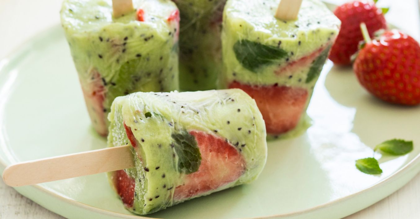 Dve nanukové formy naplníme rozmixovanou zmesou, nakrájaným kivi, jahodami a mätou. Do stredu vložíme drevené paličky a dáme asi na 6 hodín zamraziť.