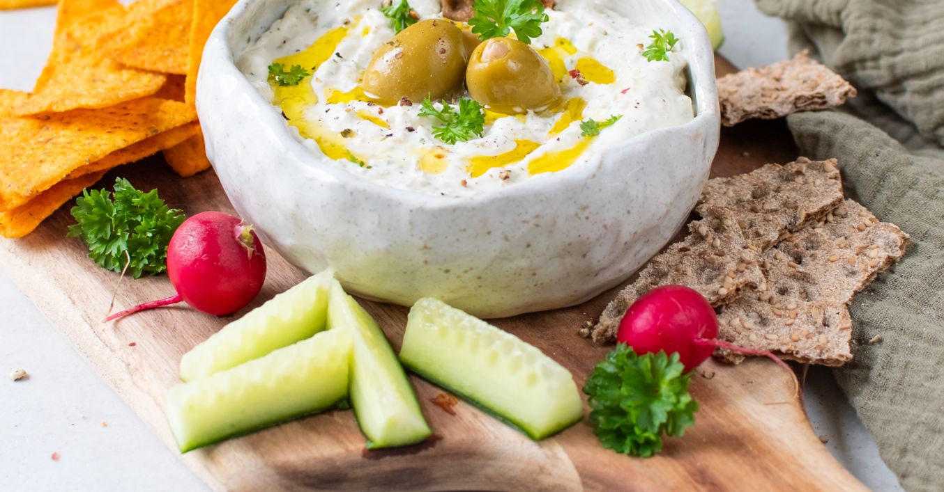 Hotový dip podávame s knäckebrotom, tortillovými čipsami a čerstvou zeleninou.