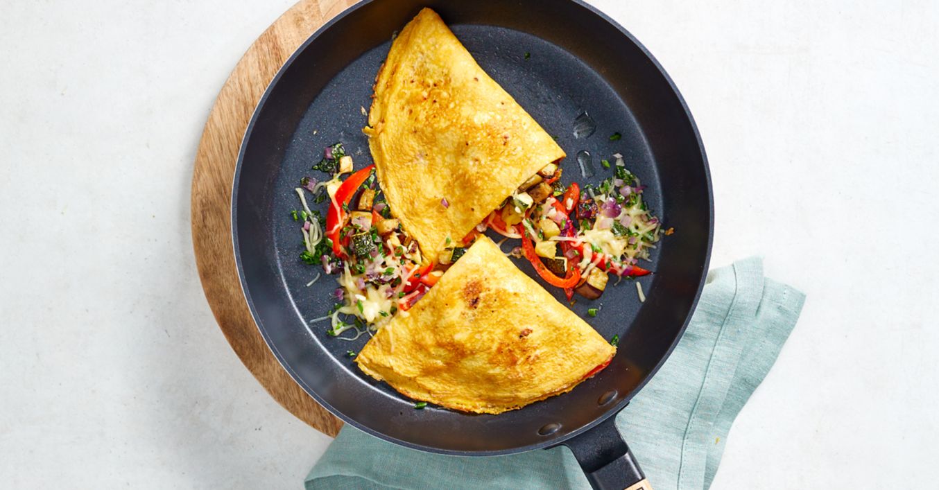 Pažítku umyjeme, osušíme a nasekáme nadrobno. V miske rozšľaháme vajcia s mliekom a pažítkou. Dochutíme soľou. Zvyšný olej rozohrejeme na inej panvici na miernom ohni. Na panvicu dáme zakaždým 2 rozšľahané vajcia na porciu a necháme na chvíľku stuhnúť na omeletu. Na jednu stranu omelety rozložíme zeleninu, pridáme Goudu, prikryjeme pokrievkou a necháme približne 2 minúty piecť. Potom preložíme prázdnu polovicu omelety na zeleninu a podávame.